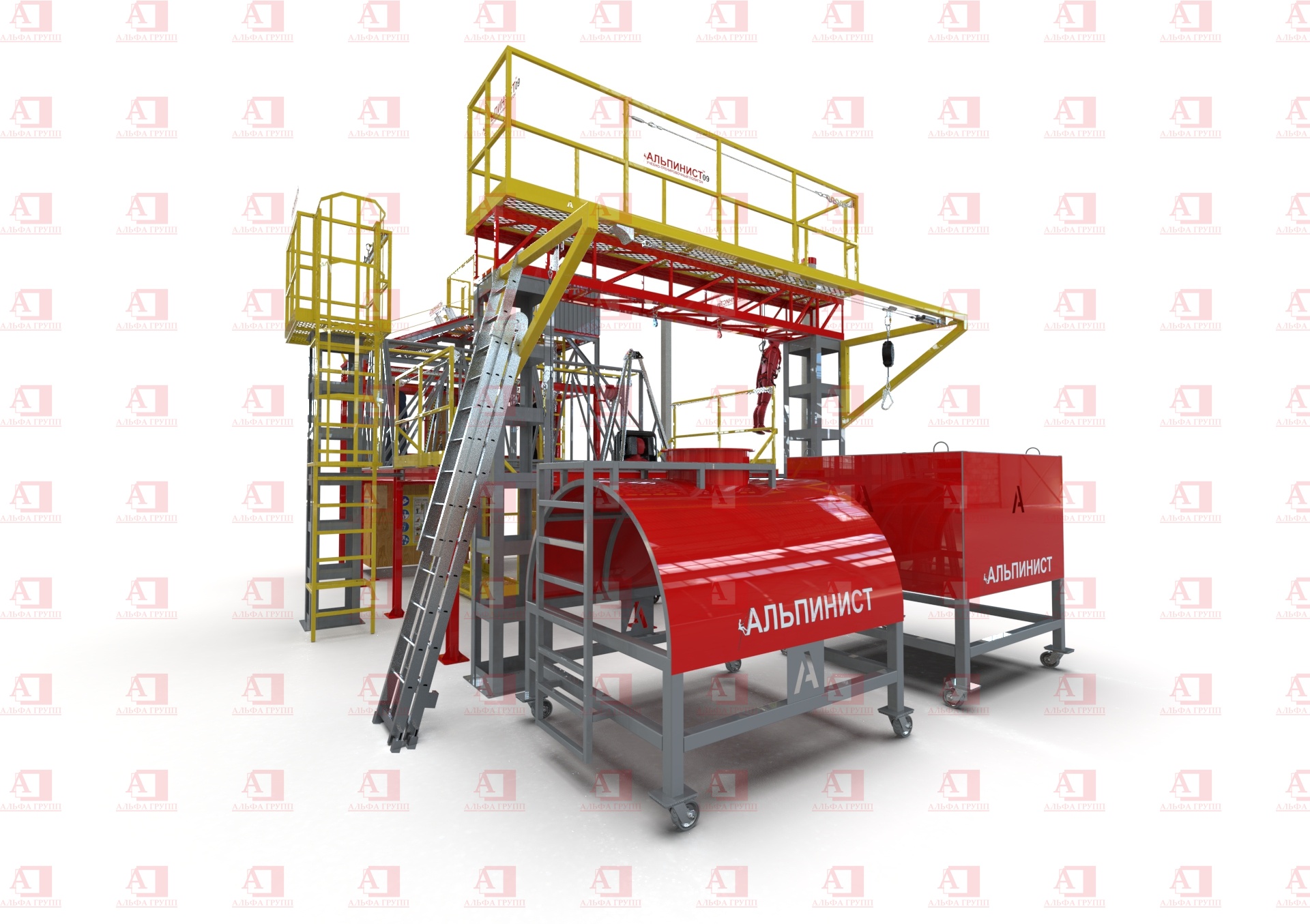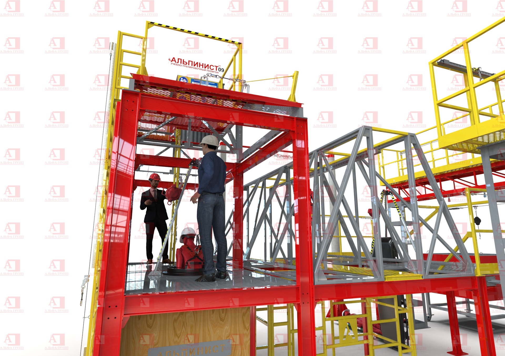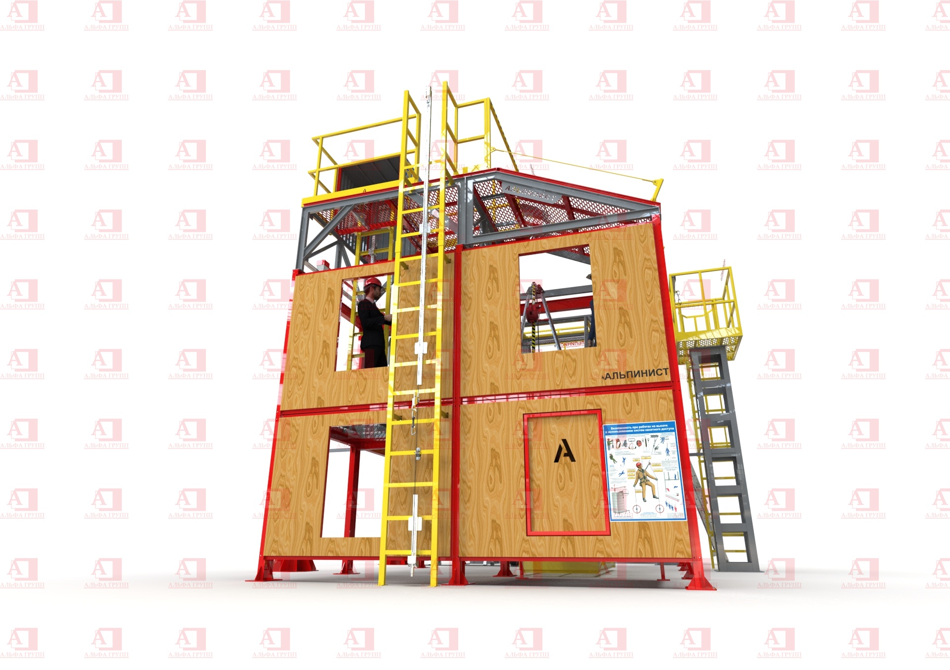 Очень функциональный, большой тренажер для практических работ на высоте для крупных учебных центров. Его возможно использовать для получения практических навыков при работах на высоте, в замкнутом пространстве и обучении спасательным работам.